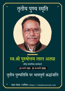 Home/शुभकामना / श्रद्धांजली शुभकामना / श्रद्धांजली 🔊 Listen to this shraddhanjli चड़ार समाज के पूर्व प्रांताध्यक्ष स्व.श्री पुरुषोत्तम लाल अठ्या को उनकी तृतीय पुण्यतिथि पर भावपूर्ण आदरांजली